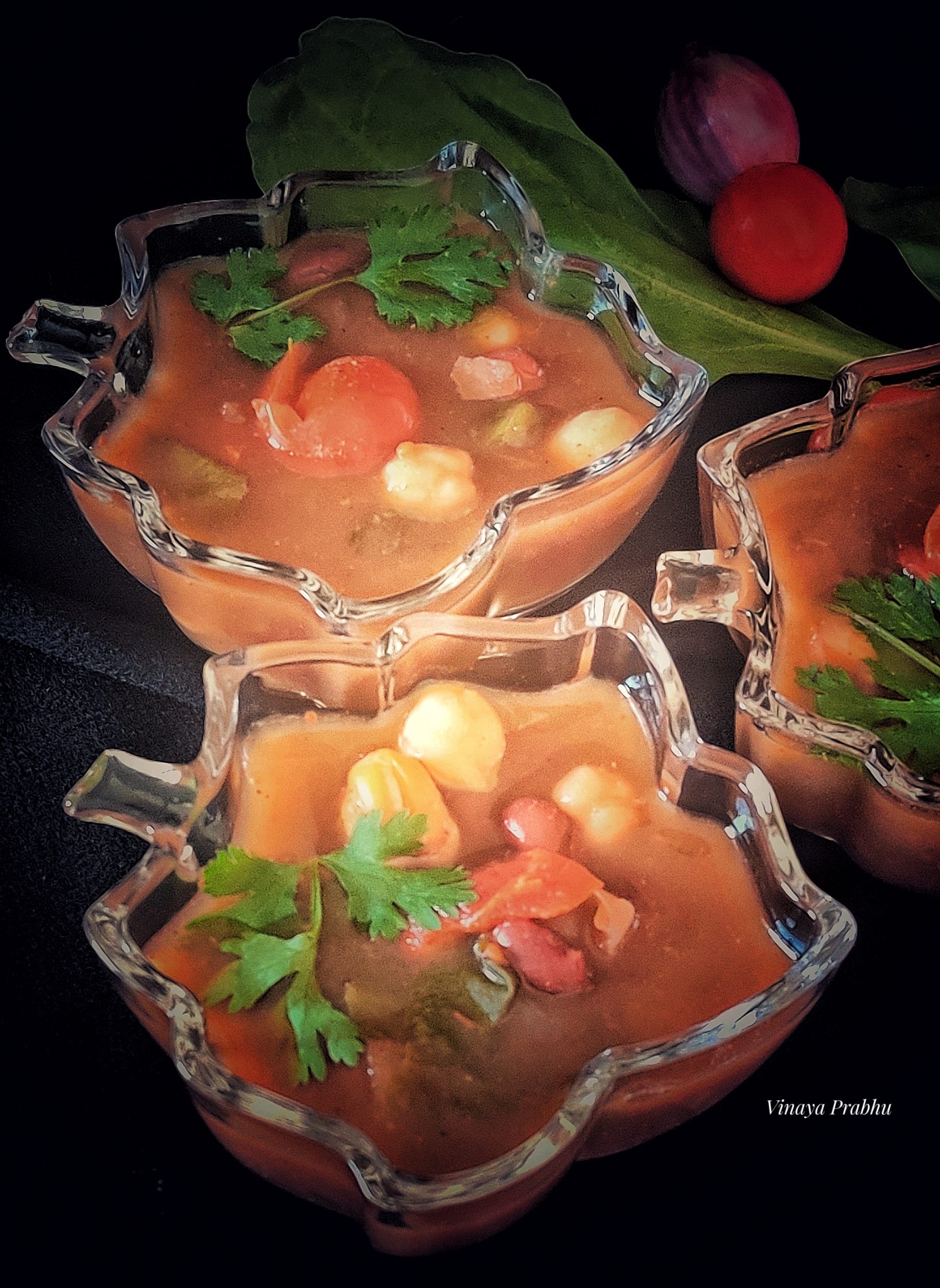 Food for the soul! A hearty soup of Kidney Beans, chickpeas, spinach and tomatoes. It is filling and in fact serves as a meal. Two bowls of this delicious soup and you can skip the rice, bread or Roti. Excellent soup for weight watchers. My heartfelt thanks to Veena Shenoy for the recipe .